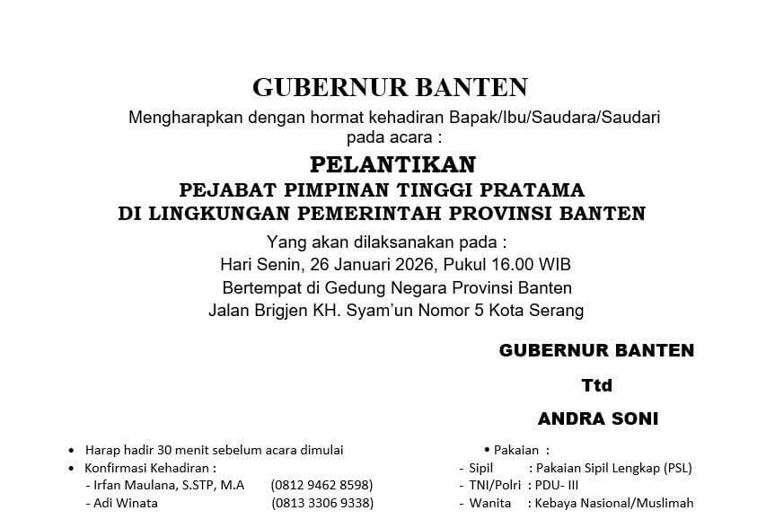 Beredar Undangan Pelantikan Eselon 2 Pemprov Banten, Digelar Hari Senin