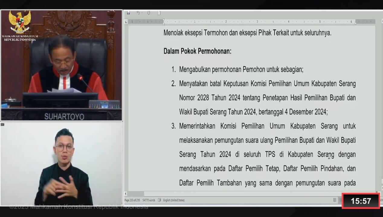 Putusan tersebut dibacakan oleh Ketua MK Suhartoyo dalam agenda pembacaan putusan perkara Nomor 70 tahun 2025 PHP Bupati Serang di ruang sidang MK Jakarta, Senin, (24/02/2025).