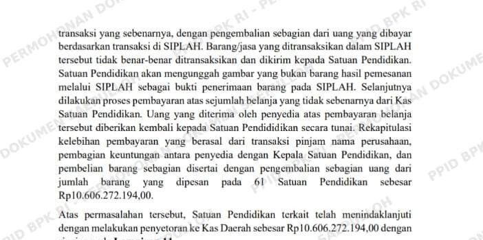 BPK menyebut, dari hasil pemeriksaan lebih lanjut terhadap proses belanja barang dan jasa di 61 satuan pendidikan itu menunjukan tidak sesuai dengan ketentuan.