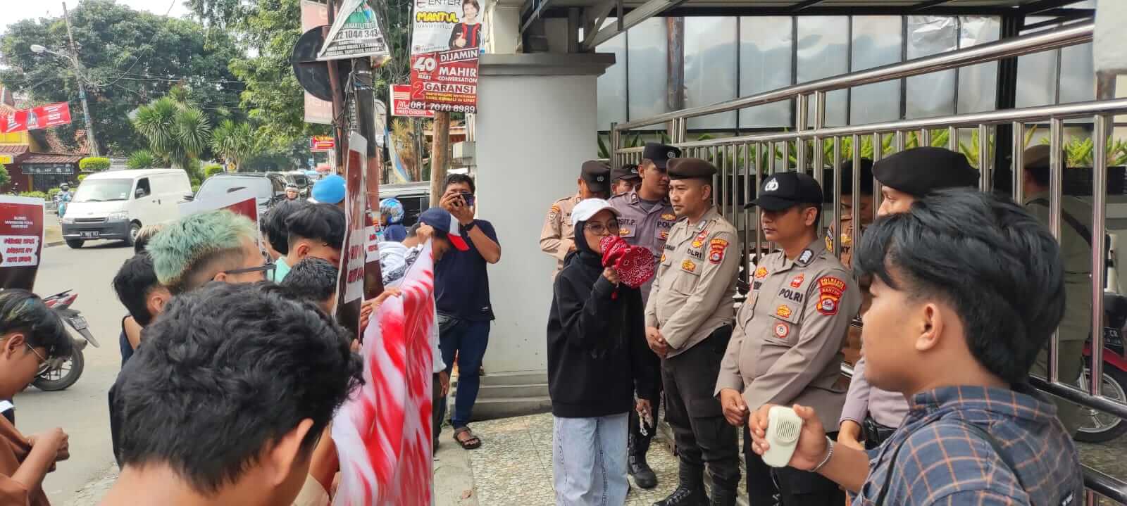 Mahasiswa yang tergabung dalam Aliansi Mahasiswa Peduli Demokrasi menggelar aksi unjuk rasa di depan kantor KPU Kota Serang di Jalan Abdul Fatah Hasan, Ciceri Bunderan, Rabu, (10/07/2024).
