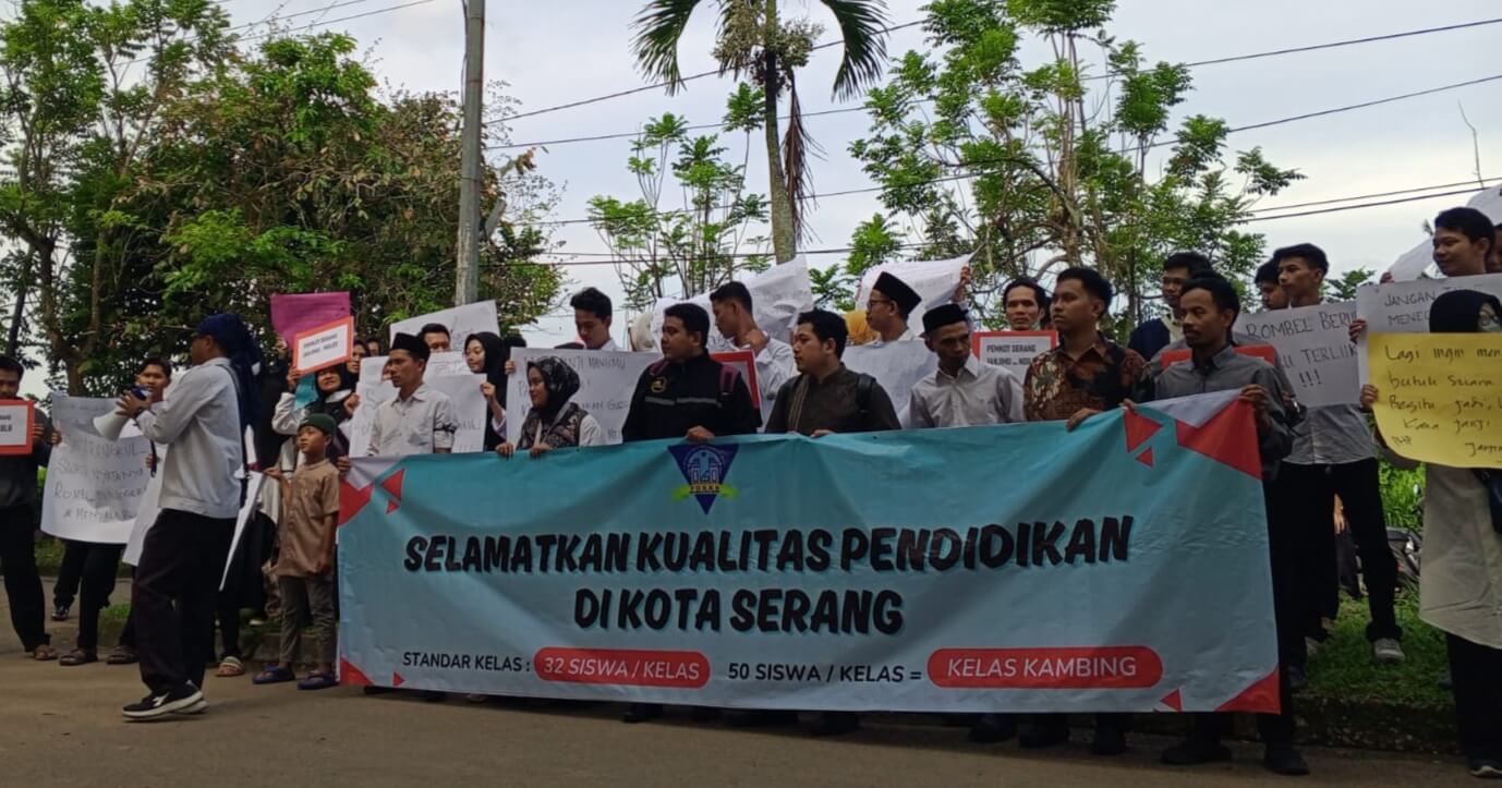 BANTEN – Ratusan guru bersama kepala sekolah SMP swasta di Kota Serang berunjuk rasa memprotes kebijakan Walikota Serang yang menambah rombongan belajar (rombel) SMP Negeri hingga 50 siswa per rombel.