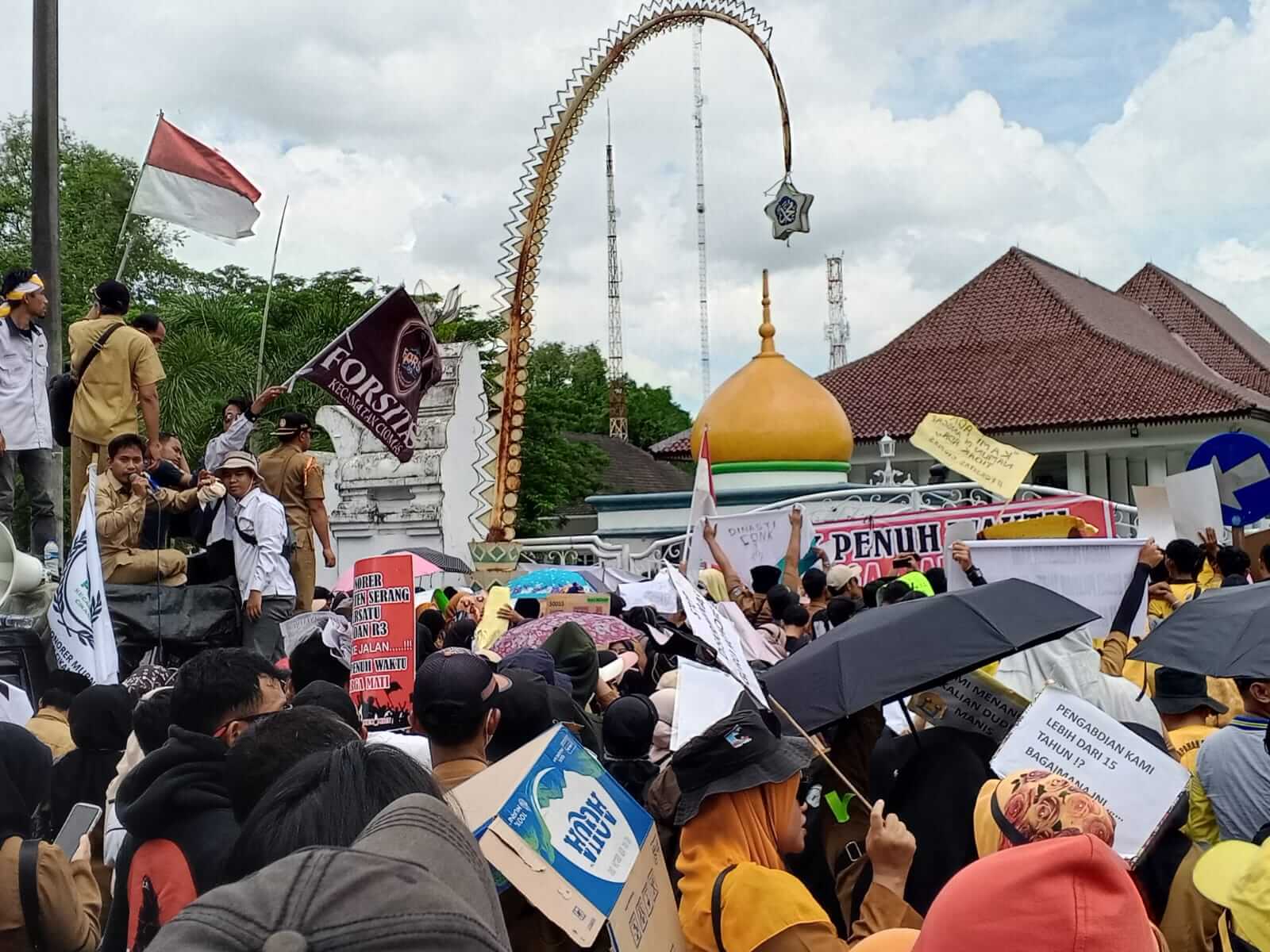 BANTEN – Ribuan tenaga honorer di Pemkab Serang melakukan aksi demonstrasi menuntut agar diangkat menjadi Pegawai Pemerintah dengan Perjanjian Kerja (PPPK) penuh waktu.