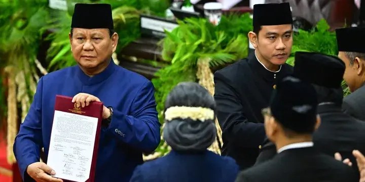 JAKARTA – Prabowo Subianto dan Gibran Rakabuming Raka resmi dilantik menjadi Presiden dan Wakil Presiden Indonesia di gedung MPR Senayan, Jakarta, Minggu (20/10/2024).