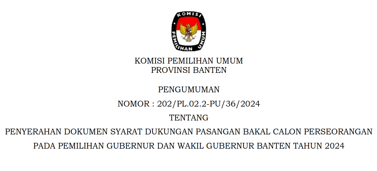 PENGUMUMAN PENYERAHAN DOKUMEN SYARAT DUKUNGAN PASANGAN BAKAL CALON PERSEORANGAN PADA PEMILIHAN GUBERNUR DAN WAKIL GUBERNUR BANTEN TAHUN 2024